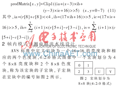 AVS标准中规定,对一帧图像进行编码时是以宏块为单位进行编码,宏块内编码则是以子宏块编号依次进行,亮度块与色度块分别编码。在对图3所示8×8子宏块F进行帧内预测时,相邻的上边和左边宏块已经完成了重建过程,参考样本存入寄存器中等待使用。当前预测块F为0号子宏块时,帧内预测使用的参考样本均来自相邻宏块的重建像素且参考样本A、B、C、D、E均可用;当前预测块F为1号子宏块时,来自相邻宏块的参考样本A、B、E和来自0号子宏块的参考样本C可用,其他参考样本均不可用;当前预测块F为2号子宏块时,分别来自0号和1号子宏块的参考样本A、B和来自相邻宏块的参考样本C、E可用,其他参考样本均不可用,对于来自1号子宏块的参考样本,只用到参考样本块B中的第一个样本(即参考样本r[9]),由于相邻像素之间相似度很大,本文使用参考样本r[8]代替r[9],这样只需使用0号子宏块的重建像素;当前预测块F为3号子宏块时,来自0号、1号和2号子宏块的参考样本E、A、C和来自相邻宏块的参考样本B可用,宏块内的依赖性最强。同样可以得出,色度子宏块编码时在宏块中没有依赖性。所以在对子宏块逐块进行编码时,可以在亮度子宏块预测过程之间插入色度子宏块的预测过程。帧内预测器流水线设计如图4所示。由于1号、2号子宏块的参考样本均只来自0号子宏块的重建像素,因此可以依次对这两个子宏块进行预测,再对V色度子宏块进行预测,最后对3号子宏块进行预测。在对色度块进行预测的同时亮度块进行重建,在流水编码时无需等待相邻子宏块的重建像素,提高了工作效率。