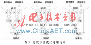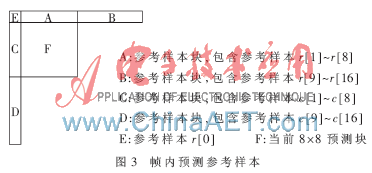 帧内预测编码器的另一个设计重点是模式预测电路的硬件设计。参考文献[5-6]提出了针对H.264中帧内预测的可重构硬件电路。该电路可根据预测模式的不同对运算模块和数据通路进行重构,从而达到对资源的最优化利用。其缺点是像素块处理速度慢,不利于实现高清实时编码。参考文献[7-8]针对预测值求解算法相同的模式设计了一个共用的预测器,从而优化硬件资源。本文采用第二种方法,通过分析各预测模式之间的关系,设计出一个模式通用的预测器,并采用8路数据并行处理,解决了可重构硬件电路处理速度慢的问题。