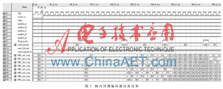 本文根据高清视频实时编码的实际要求,设计实现了AVS帧内预测编码器的硬件电路。该编码器每个时钟周期可处理8个像素,采用并行流水线结构对各个模式进行预测。该设计使用Verilog HDL语言完成硬件的编写,选用Altera公司的Cyclone II 系列2C35 FPGA芯片进行了综合和验证,部分仿真结果如图7所示。其中enable_A~enable_E表示为预测块所用参考样本的可用性,valid_mode表示有效模式输出,PE0_out_reg~PE7_out_reg表示8个像素预测输出。从仿真图中可以看出,电路按照本文设计的流水线进行预测,每8个时钟周期完成一个预测模式的预测,预测结果正确。本设计所占用的逻辑资源数量较少,节省了硬件资源;且本设计提出的并行流水线结构能够提高帧内预测电路的工作速度,满足了高清视频实时编码的要求,对AVS高清视频编码芯片设计具有一定的意义。