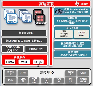 TI此次推出的ADAS SoC分别有TDA2xA、TDA2xV和TDA2xF 3款芯片,分别对应前置摄像机、环绕视图和传感器融合应用,以让厂商能够更有针对性的选择芯片,它们的高性能、高可靠、可扩展性、更低功耗和高集成度让汽车厂商无后顾之忧。说了这么多,现在开始揭秘TDA2x的内部结构,如图1所示。其属于多核异构的SoC,有两个C66x DSP 内核、多达4个视觉加速器内核AccelerationPac(每核10.4 GMAC)、两个ARM Cortex-A15内核、两个双ARM Cortex-M4内核、内部存储器、6 个摄像机输入和多个显示输出,采用28 nm工艺技术,功率范围约为2 ~ 5 W。