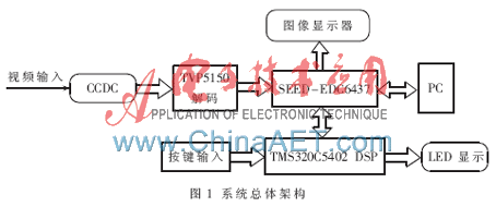 本文采用双DSP芯片,其中TMS320C5402为控制器,TMS320DM6437为算法处理器,以CCS 3.3为软件开发背景,完成了基于DSP/BIOS的图像采集处理平台的软件设计。TMS320C5402作为控制器,主要负责人机交互界面的控制,它与TMS320DM6437通过多通道缓冲串口通信,控制器主要对键盘数据的读入和LCD数据的输出。同时系统还添加了远程控制模块,通过PC发送控制指令调度DM6437处理器,能够完成切换算法,调停当前状态等功能,系统总体架构如图1所示。