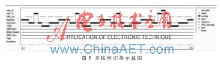 本系统中多线程最高优先级为UART接收和McBSP中断,其次为软中断UART数据读入和UART发送,最后为任务,任务中划分为多个算法的任务,其相互间通过按键或PC指令切换,其线程间根据Mail_box(n)通信,其同步是根据SEM(m),在DSP/BIOS调试界面可见多线程间切换示意图,如图5所示,可见程序运行正常。