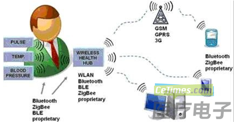 无线技术或者说无线传输模块,是实现无线医疗的基础。由于无线技术的爆炸式增长,市场上出现了许多新兴无线标准,特别是在工业科学与医疗 (ISM) 频段。广大医疗服务提供商正充分利用无线技术的发展,力图抓住大好机遇。任何人都可以使用 ISM 频段,无需获得授权批准。唯一的要求是,所开发使用的产品必须遵守适用于该频段的一些规定。如 ZigBee?/IEEE802.15.4、Bluetooth?、BLE? 和 ANT 等新标准同一些次 1GHz 或者 2.4GHz 频谱工作的其他专有技术一起,广泛应用于医疗领域。