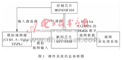 利用单片机MSP430F169与解码芯片ADV7183B的配置,使得整个视频解码系统可以灵活地根据输入视频源进行相应的配置以输出不同的数字视频数据。MSP430F169的最高运算速度达到8 MIPS,具有易操作、低功耗等特点[3-4],特别是其可通过I2C接口与解码器进行数据传输,以实现对不同格式视频输入源的解码。而ADV7183B是一款综合的视频解码芯片[5-6],它能够自动将一种兼容国际标准NTSC或PAL的模拟视频基带信号转换成另一种兼容8 bit/16 bit CCIR656的YCrCb型4:2:2的数字视频数据,其灵活的数字式输出接口能够在基于缓存器结构和行锁时钟的系统中完成视频解码和转换功能。视频解码系统的硬件框图如图1所示。MSP430F169是主控芯片,针对不同的模拟视频源,利用C语言编程,对解码芯片ADV7183B的寄存器进行相应的配置,产生符合要求的数字视频数据及行、场信号,以便于视频后处理系统进行滤波、显示。