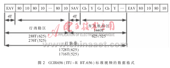 图2中,T为采样时钟37 ns(27 MHz);SAV为有效视频开始的定时基准标志码;EAV为有效视频结束的定时基准标志码;每个基准信号由4个周期的数据组成,格式为FF,00,00,XY,以16进制表示,前3个为固定的前缀,第4个字用来定义奇偶场、场消隐和行消隐信息。在消隐期间,传输80 H,10 H,80 H,10 H;在有效期间,按Cb,Y,Cr,Y,Cb,Y顺序传送。