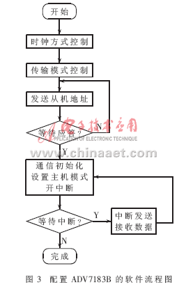 由于MSP430F169和ADV7183B均有自带的I2C模块,利用I2C总线协议,系统通过中断程序进行解码芯片的各种寄存器配置,从而产生YCrCb型4:2:2的数字视频数据,软件流程图如图3所示。