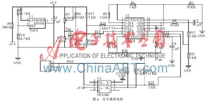 体位传感器选用ADXL345加速度传感器,基于iMEMS技术的3轴数字输出加速度传感器,超低功耗及标准的I2C或SPI数字接口,非常适合于移动设备应用[5]。体温传感器选用Pt100温度传感器应用于人体温度的测量,测量范围比较窄,36℃~42℃即可满足要求,信号调理电路设计采用惠斯登电桥电路,如图4所示。