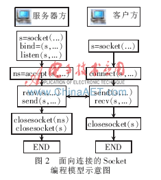 基于VB.Net的Socket对象是客户端和服务器端进行后台通信的根本,Socket是为计算机提供的一个通信端口,可以通过这个端口与任何一个具有Socket的计算机进行通信。应用程序在网络上传输、接收的信息都通过这个端口来实现。VB.Net对原有的Socket类和相关的方法进行了一系列封装,使程序变得更加简单。其面向连接的Socket编程模型示意图如图2所示。