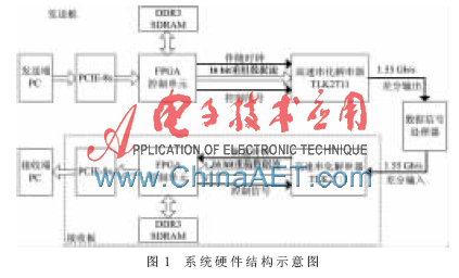 本文研究的是一种基于TLK2711的高速串行传输方案,在实现高速实时数据传输的基础上进行数据信号处理。系统中的关键组成部分包括PCI Express总线接口模块、FPGA数据处理控制模块、DDR3 SDRAM存储模块以及TLK2711高速串/并转换接口模块,系统框图如图1所示。系统的工作原理:发送端PC通过PCI Express总线接口与发送板进行数据通信,将PC模拟的卫星成像数据源通过缓存DDR3 SDRAM由TLK2711高速串/并转接口发送给数据信号处理器;经过数据信号处理器处理的数据再通过TLK2711高速串/并转接口发送给接收板,接收板通过缓存DDR3 SDRAM由PCI Express总线接口上传给接收端PC,最后在接收端PC中进行数据校验和相应处理。