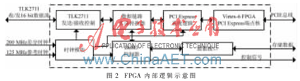 经过数据信号处理器处理过的数据以串行差分方式通过铜缆传送给接收板的TLK2711,TLK2711在参考时钟下完成高速串行输入数据的串/并转换,转换后的20 bit并行数据经过内部同步到恢复时钟,然后利用8B/10B解码格式将20 bit并行数据解码为原始的16 bit并行数据输出到FPGA进行数据处理,FPGA通过内部逻辑对高速数据进行必要的时序控制和相关处理。这个过程主要是去除帧头、帧尾、同步字符,同时检测控制信号并对数据进行处理。处理过后的数据缓存到片外的DDR3 SDRAM,在总线主控DMA控制器的控制下,通过PCIE-8x通道将缓存的数据写入计算机硬盘。FPGA内部逻辑示意图如图2所示。