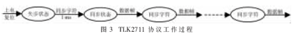 TLK2711高速串行协议是一种基于点对点的单工协议,它以16 bit为一个基本的传输单位,数据被分成了高8位和低8位,因此每个控制字符都定义成了2 B(分别由D码和K码组成),编码方式由2个控制信号TKMSB/RKMSB和TKLSB/RKLSB决定。协议的工作过程如图3所示。