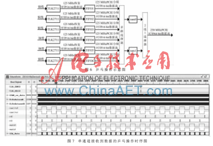 按照设计思路将模块功能在Xilinx公司的FPGA设计平台ISE 14.2上进行代码编译综合、功能仿真和时序仿真等,通过JTAG口将程序下载到FPGA中进行实际运行,然后利用ISE 14.2自带的逻辑分析仪采集所要观察的数据信号并进行在线调试。图7为使用ISE 14.2中Chipscope采集的对单通道TLK2711接收到的数据进行不同时钟域处理和乒乓操作的时序图。从图中可以看出整个工作情况与以上描述一致,证明该模块从代码设计和时序约束到功能实现全部通过,数据传输速率在TLK2711芯片内可以达到194.74 MB/s。