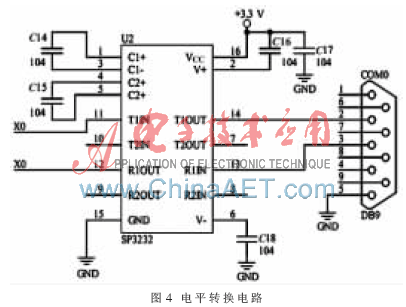 由于串行输入输出口是TTL电平信号,TTL电平在0~5 V之间,其逻辑1的电平在2 V以上,逻辑0的电平在0.8 V以下。而只有RS-232电平才能与PC机连接。RS232为全双工通信,通信距离为15 m。RS-232电平:逻辑1的电平在-3 V~-25 V之间,通常为-12 V;逻辑0的电压在+3 V~+23 V之间,通常为+12 V。所以要用到MAX3232转换电平。转换电路如图4所示。