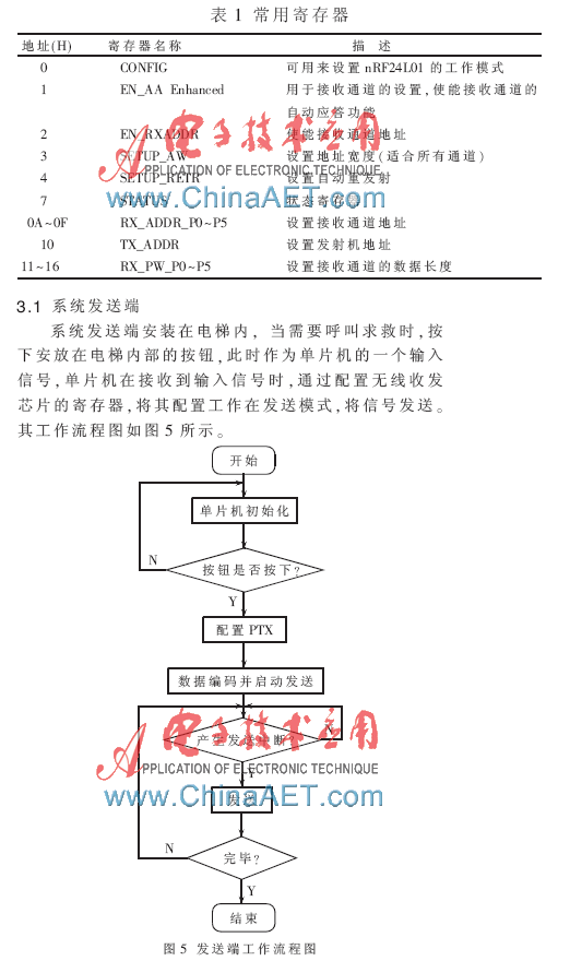 发送端将nRF24L01配置为增强型的ShockBurstTM发送模式,在该模式下,只要MCU有数据要发送,nRF24L01就会启动ShockBurstTM模式来发送数据。在发送完数据后nRF24L01转到接收模式并等待终端的应答信号。如果没有收到应答信号,nRF24L01将重发相同的数据包,直到收到应答信号或重发次数超过SETUP_RETR_ ARC寄存器中设置的值为止,如果重发次数超过了设定值,则产生MAX_RT中断。