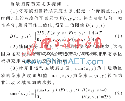 基于背景差分可以得到较完整的运动区域,因此需要首先获得背景图像。这里采用参考文献[6]的方法来完成背景图像的初始化及背景更新。通过相邻帧差分的二值图像找到运动的像素,将这些运动区域的像素值丢弃,只对非运动区域的像素值进行累加,最后求平均。该算法可以很好地消除运动目标的影响,得到较完整的背景图像。