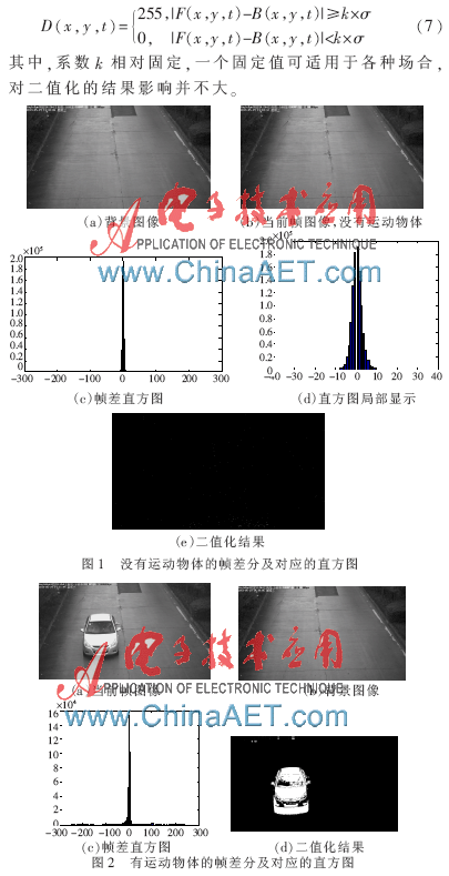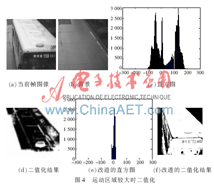 这里可以利用背景更新中的计数器sTime(x,y,t)中包含的信息,它描述了一个像素位置属于背景的持续帧数,如果该计数器的值很大,则表明该像素位置一直属于背景,那么判断该像素位置属于背景区域是比较可靠的。这里假定sTime(x,y,t)>t,则该像素属于真正的背景区域。这样就得到了的真正背景区域,然后用当前帧中真正的背景区域与背景图像对应的区域作差分,再对该差分进行直方图统计,如图4(e)所示,计算均值和方差,该均值和方差是属于背景区域的均值和方差,得到的阈值是正确的二值化阈值。最后再用该阈值对当前图像与背景差分作二值化,得到正确的运动区域,如图4(f)所示。