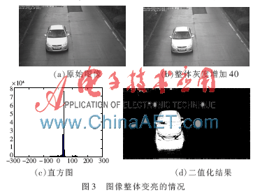 当图像亮度发生整体变化时,直方图中峰值的位置也发生了变化,如图3所示。二值化阈值能够自适应地得到合理的阈值,从而得到较好的运动区域。