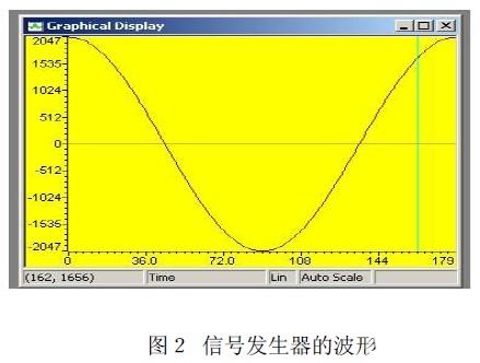 一 Project 菜单中 Rebuild All选项,编译链接该工程,没有错误后,选择 File菜单中 Load Program选项,选择 *.C文件,进行加载程序。选择 View菜单中 graph选项中 Time/Frequency设置图形属性,选择 Start Address 为 DACdata ,设 Acquisition Buffer Size为 180 ,设 Display Data Size为180 ,设 Dsp Data Type为 16-bit signed integer。点击 OK ,观察信号发生器的波形,如图2: