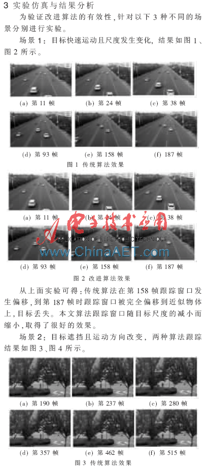 从上面实验可得:传统算法在第158帧跟踪窗口发生偏移,到第187帧时跟踪窗口被完全偏移到近似物体上,目标丢失。本文算法跟踪窗口随目标尺度的减小而缩小,取得了很好的效果。