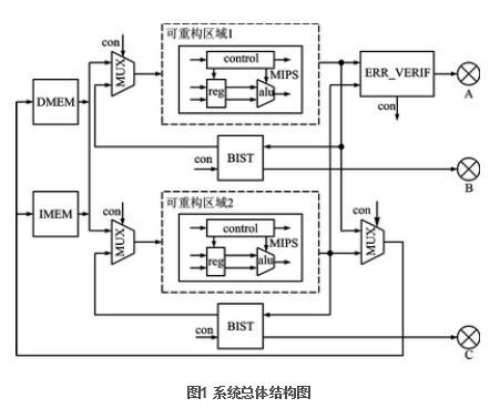 在图1中,以虚线框起来的部分为FPGA中的可重构区域。图中有两个可重构区域,上一个区域为主子系统区,下面一个区域为主子系统区的备份区。