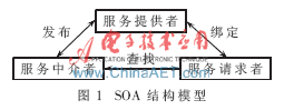 1996年Gartner提出SOA,目的是让企业业务更加敏捷,软件系统变得更有弹性,使企业能快速响应需求的变化。SOA技术是一种有效解决系统由异构性所产生的问题的新体系架构,其思想是提供统一接口,通过服务的发布、发现以及调用等机制为其他应用程序提供服务。通过SOA构建的服务,可以使不同平台、不同语言开发的应用进行相互调用,可以最大程度地减少各应用系统间的耦合,在不改变原有应用系统结构的情况下实现应用的无缝缝合,达到数据交换的目的。而Web Service[3]是SOA的一种具体实现,是一种跨平台、跨语言的服务,它执行特定的任务,遵守具体的技术规范[4],如XML[5]、SOAP[6]、WSDL[7]、UDDI[8]等标准。Web Service以一种松散服务的捆绑集合形式,通过开发、发布和动态绑定实现异构系统之间的通信。WSDL定义的接口描述了Web Service,而WSDL的语义用XML进行定义。UDDI是一种与语言无关的协议,用于与注册中心进行交互以及查找服务。图1是基于Web服务的SOA结构模型。