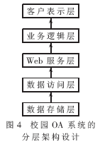 校园OA系统使用SOA架构实现所有功能。为了使系统能够更好地适应各功能模块的集成,实现各模块之间的松散耦合,并提高系统数据的安全性,使用分层设计模型的思想设计系统,如图4所示。