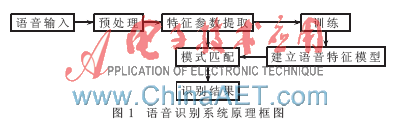 语音识别技术就是对不同说话人的不同说话内容进行准确的识别,其本质是属于模式识别的范畴。系统原理框图如图1所示。从图中可以看出,识别结果的正确与否与模式匹配息息相关。计算机首先从特定人处取得语音信号并训练制作成语音的特征模型库。当系统需要进行语音识别时,对新输入的语音信号进行分析,抽取其语音特征参数。通过与语音系统中所储存的特征模型进行对比,在一些特定的搜索和匹配策略下寻找最优的匹配模板。通过查表系统就能给出语音识别的结果。其主要步骤分为:预处理、特征参数提取、语音的训练与识别。