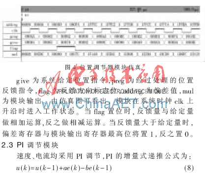 从图5可见,模块在clk1上升沿动作,当偏差值preg没有超过给定限幅值时,addreg对偏差值做累和运算,data为模块比例环节输出,dout2为模块比例积分调节数。系统速度环使用PI调节器。而当偏差值大于限幅值时,addreg清零,此时积分运算环节关闭。当下一时钟上升沿来临时计算此时偏差值,若没超过限幅值积分环节重新参与运算。dout2最高位为符号位,0表示输出数为正数,1表示输出数为负数,如图中10045表示速度调节环调节指令数为-45。电流调节器设计完全相同,参数按典型1型系统设计[4]选取,不再重述。