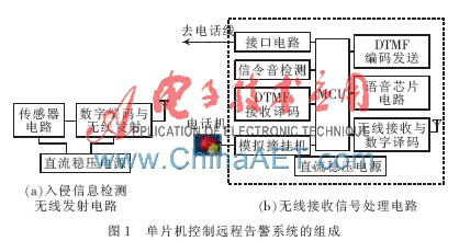 本文所述的单片机控制远程告警系统如图1所示。系统由入侵信息检测无线发射电路和无线接收信号处理电路两部分组成。