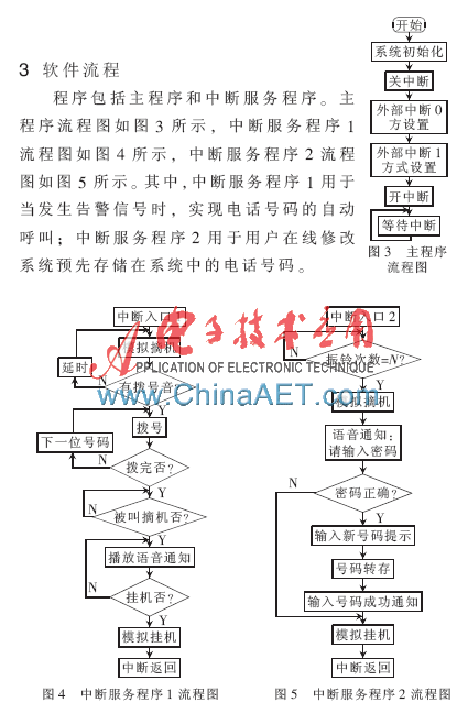 摘 要: 分析和设计了单片机控制的远程告警系统,给出了软件流程图。该系统以微控制器(MCU)为核心,结合其他外围模块电路,通过公众交换电话网络实现远程自动语音告警,用户也可以方便地在线修改预先存储在系统中的电话号码。系统利用了现有的电信网络基础设施,用户无需额外的投资,具有成本低廉、告警迅速、及时可靠的特点,可应用于家庭、学校、办公室等场合的安全防范。