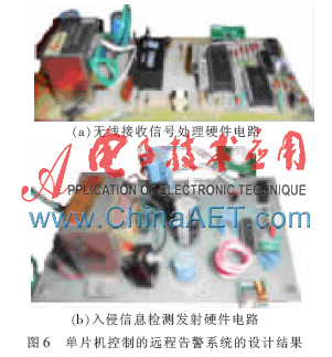 电话网络的出现,为信息提供了广泛、可靠、及时的传输、交换途径。本文介绍的单片机控制远程告警系统的硬件设计结果如图6所示,其中图6(a)为无线接收信号处理硬件电路,图6(b)为入侵信息检测发射硬件电路。