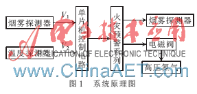 图1所示为具有自动警报和灭火功能的单片机系统原理图。系统划分为信号采集模块和信号处理模块两个模块。