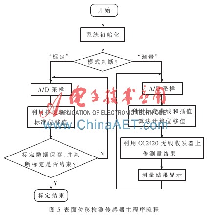 基于ZigBee无线传感器网络的表面位移检测传感器软件采用Keil C51设计,主要包括主程序模块、按键输入模块、液晶显示模块、参数标定模块、位移测量模块和ZigBee无线通信模块等。单片机首先在液晶屏上显示开机信息,然后根据硬件设置,分别进入“标定”和“测量”模式。“标定”模式下,单片机在按键的控制下采集标定曲线,为位移的精确测量提供基准数据;“测量”模式下,单片机采集、计算、显示测量结果,同时将测量结果通过CC2420无线收发器传送给Sink节点,并由Sink节点统一将信息上传光纤环网,供监控计算机分析、处理。系统软件主程序流程如图5所示。