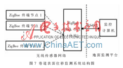 利用所设计的传感器可以方便地组成各种巷道表面位移自动监测系统,系统结构如图7所示。系统主要由地面监控计算机系统和井下无线传感器网络两部分组成。监控计算机负责信号的分析、处理、汇总和统计,监测软件采用VC6.0高级语言设计。无线传感器网络由分布在巷道中的多个智能ZigBee传感器节点和Sink节点组成,网络的拓扑结构采用树状网。传感器节点完成巷道表面位移的检测,包括顶板下沉量和两帮移近量,并将测量数据以无线通信方式汇聚到Sink节点;Sink节点通过RS485总线的方式与光纤环网相连接。光纤环网将无线传感器网络采集到的表面位移信息传送到地面监控计算机,监控计算机根据接收到的数据信息,对巷道表面位移变化情况进行实时监控,并对可能发生的安全事故做出提前预警。
