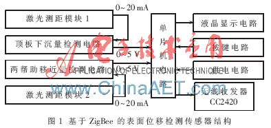 近年来,ZigBee无线网络技术迅速发展起来。ZigBee是一种基于IEEE 802.15.4协议的短距离、低功耗、低复杂度、低成本的无线网络技术[3-4]。针对ZigBee技术的特点和煤矿巷道表面位移监测的技术现状,本文设计了一种基于ZigBee无线传感器网络的表面位移检测传感器。该传感器利用先进的激光测距模块配合相应的放大调整电路实现位移的精确测量,以无线通信的方式将测量结果传送给分站,并由分站上传地面监控计算机,实现井下巷道表面位移情况的实时、可靠监测。