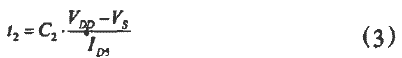 这里由于C1电容远大于M1、M2管的漏端电容和与非门NAND1的输入电容之和,因此可忽略它们的影响,Id2为V受控制的电流源M2管的电流。