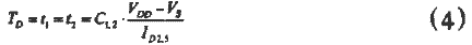 下面计算单元电路的延迟时间,以C1为例,当输入为高电平时,电路通过电流源M2管对电容放电,当电容两端电压降至输入与非门NAND1的翻转点Vs时,与非门输出状态转换,其状态从“0”到“1”的转换时间为: