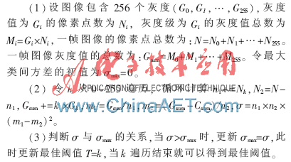自适应阈值是指处理和分析过程中,根据处理数据的数据特征自动获得适应环境变化的阈值,在不同环境下都能得到较理想的二值图像,使系统智能化。本系统采用最大类间方差法(Otsu)来获取阈值。它是按图像的灰度特性将图像分成背景和目标。背景和目标之间的类间方差越大,说明构成图像的背景和目标的差别越大。算法如下: