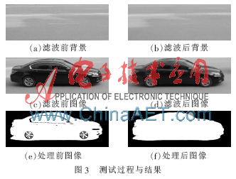图3(a)是某时刻滤波前的背景图像,图3(b)是滤波后的背景图像。图3(c)是当车经过时捕捉的图像,图3(d)是滤波后的图像,根据滤波前与滤波后图像的对比可知,滤波后的图像比较光滑,噪声比较少,利于后续的处理。图3(e)是处理前的二值图像,图3(f)是处理后的二值图像,对比图3(e)与图3(f)可知,经过开运算及区域填充处理后图像的黑色小点明显减少,更加贴近前景的轮廓,使处理结果更加准确。