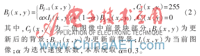 其中,Bj(x,y)为更新后的背景;Bj-1(x,y)为更新前的背景;Ij(x,y)为当前图像;?琢为迭代速度系数,本系统取α=0.3。