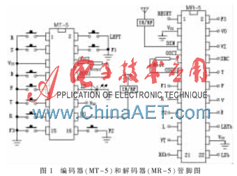 编码器(MT-5)和解码器(MR-5)是一对能精确控制遥控汽车的编解码器,其管脚图如图1所示。MT-5的S键和MR-5的SRC键用来控制16位随机地址码学习功能,8个控制键F(前进)、B(后退)、R(右转)、L(左转)、T(加速)、F1~F3(附加功能)用来遥控汽车的运动(如匀速前进、加速前进、右转以及多种状态组合的功能)。当按下地址码学习请求键S和地址码学习允许键SRC后,MT-5发送学习请求,MR-5接收到该学习请求后,进行请求状态识别和地址码数据检测,再进行16位随机地址码学习。学习完成后,MT-5就可以发送控制功能请求了,MR-5接收到该请求后进行请求状态识别、地址码判断和请求功能数据检测,最后进行相应的控制功能驱动[2]。