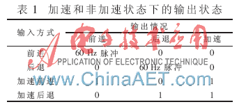 遥控汽车在非加速状态下前进和后退对应的F和B输出端输出60 Hz的脉冲,间歇地驱动电机转动,使遥控汽车处于非加速运动状态;而加速状态下前进和后退则对应F和B输出端输出高电平,持续驱动电机转动,从而使遥控汽车处于加速运动状态,如表1所示。