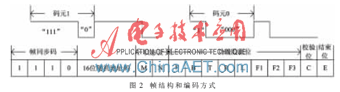 为建立遥控汽车的通信关系,MT-5和MR-5必须共同遵循一个预先协商好的帧协议[2-3]。在发送端数据按照帧协议的约定,把帧同步码、随机地址码、请求状态位、功能数据位、奇偶校验位、结束位等装入帧中后送入传输线路,接收端接收到帧后根据预先协定好的帧格式来进行同步、识别、校验和解码接收。信号发送过程中,码元为“1”时用占空比为3/4的矩形脉冲表示,码元为“0”时用占空比为1/4的矩形脉冲表示。帧结构和编码方式如图2所示,取编码频率fc=2 kHz,Tc=0.5 ms,码元信号周期Ts=2.0 ms。