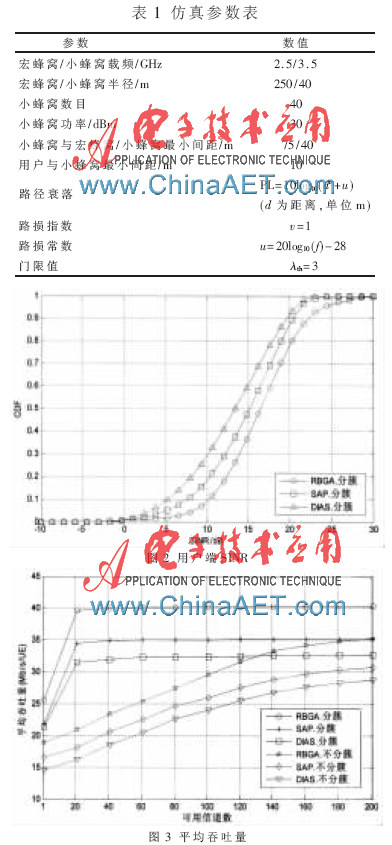 仿真中引入一个中心宏蜂窝,小蜂窝以密集部署的方式在宏蜂窝范围内随机分布。参数配置如表1所示。