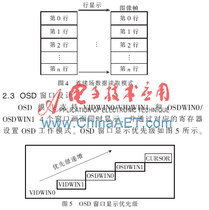每个窗口可以设置为帧模式和场模式。帧模式的特点是允许每帧图像数据连续储存在DDR2中,图像显示时按照奇偶场进行读取。场模式特点是允许图像数据单独储存在DDR2中,图像显示是根据VENC的工作模式窗口高度。处理芯片DM6437集成了DDR2内存控制器,支持JESD79D-2A标准,并提供32 bit DDR2接口。图像数据存储在DDR2中,当需要VENC连续从DDR2中读取数据时,将OSD窗口设置为连续场模式,对应的寄存器位VIDWINMD.VFFO和OSDWIN0MD.OFF0使能。连续场数据读取模式如图4所示。