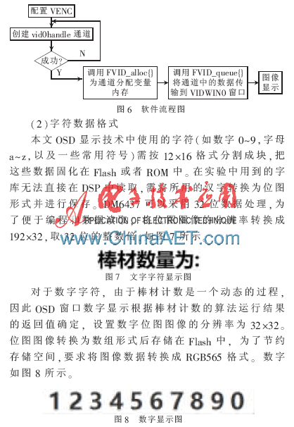 本文以棒材计数平台上实现OSD技术为例,在实现OSD模块信息和视频信息叠加时,要处理的数据量大,为了满足实时性的要求,需要选择一款集成度高,运算速度快的芯片。TMS320DM6437是TI公司推出的定点Davinci DSP处理器,工作主频可达700 MHz,处理性能最高达到5 600 MIPS,含有丰富的外设资源,芯片本身具有OSD功能,这样就不需要增加额外的硬件设计,可以通过灵活的软件编程来实现视频和嵌入的图片叠加,为用户提供简便的观测信息。