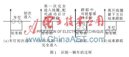 夜晚,车灯是车辆被识别的最显著元素,本文以车灯为特征对车流进行统计[2]。在车灯被识别之前,需要在视屏中设置一个虚拟检测线圈作为感兴趣区域(ROI)[3]。以车灯作为研究对象,一辆车被识别有4个阶段,如图1所示。