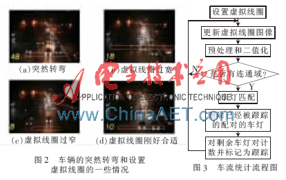 特别说明,当车灯对第一次匹配成功时便进行计数,是为了避免车辆突然转弯而在计数上有所减少。车辆的突然转弯和设置虚拟线圈的一些情况如图2所示。其中,图2(a)所示为汽车车灯完全进入了虚拟线圈,但是没有经过线圈的最下方(即图1(d)所示的情形),因此仍进行计数。
