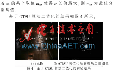 由图4可知,经过二值化和预处理以后,仍然有一些很难处理的噪声,如路灯以及路面反光所形成的连通区域,这些噪声给识别带来了麻烦。为简化过程,本文设置一个检测窗口,检测窗口只检测窗口内的车灯优化过程。由于检测窗口的选取对最后的结果有很大的影响,因此检测窗口中不能出现路灯的干扰[4]。
