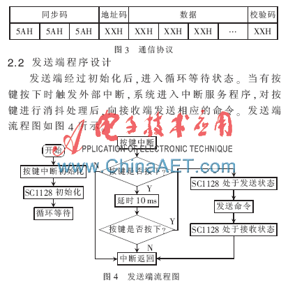 接收端经过初始化后,进入循环等待状态。当接收到数据时触发接收中断,系统进入中断服务程序。当数据有效,同步码匹配,并且接收到的地址码是本设备的地址时,就执行该命令,控制相应继电器动作;否则拒绝执行该命令。接收端流程图如图5所示。